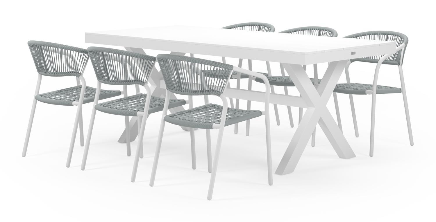 De Bahia tuinset in wit aluminium en wit aluminium tafelblad met 6 stapelbare Vigo tuinstoelen is van het merk Vinci en is hier verkrijgbaar in de kleur grijs/wit.
