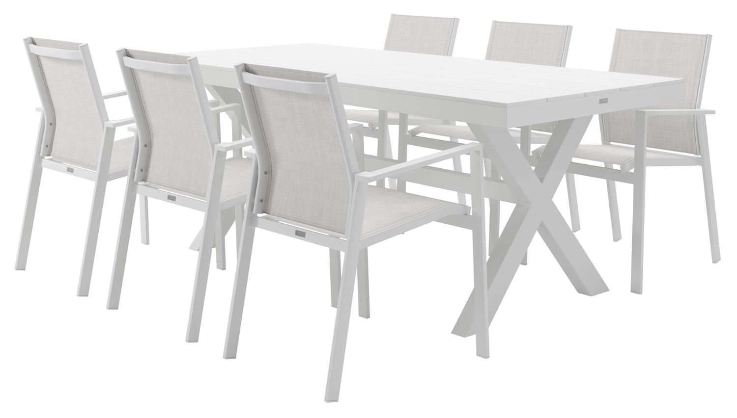 De Bahia tuinset in wit aluminium met 6 stapelbare Bahia tuinstoelen is van het merk Vinci en is hier verkrijgbaar in de kleur grijs/wit.