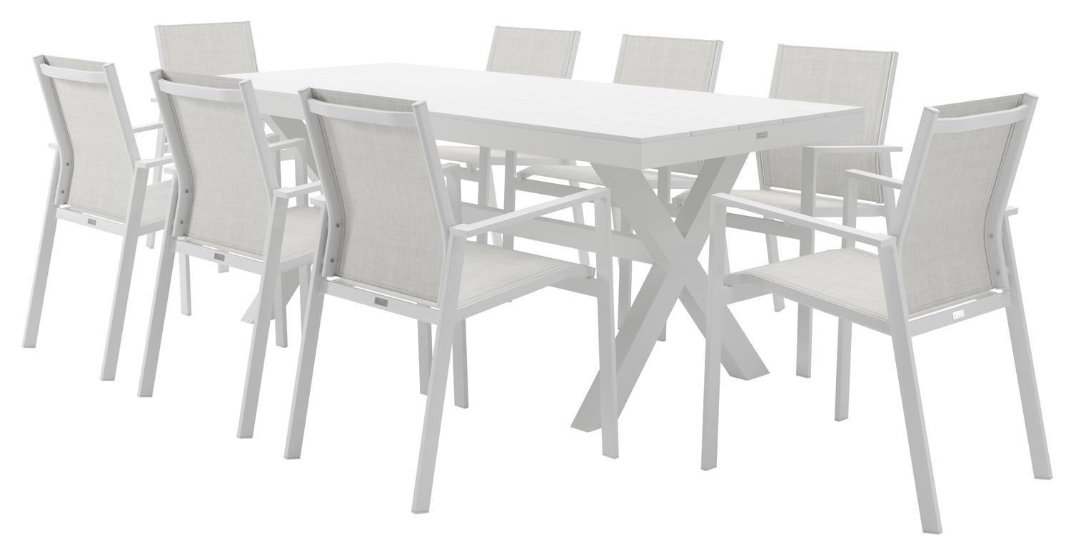 De Bahia tuinset in wit aluminium met 8 stapelbare Bahia tuinstoelen is van het merk Vinci en is hier verkrijgbaar in de kleur grijs/wit.