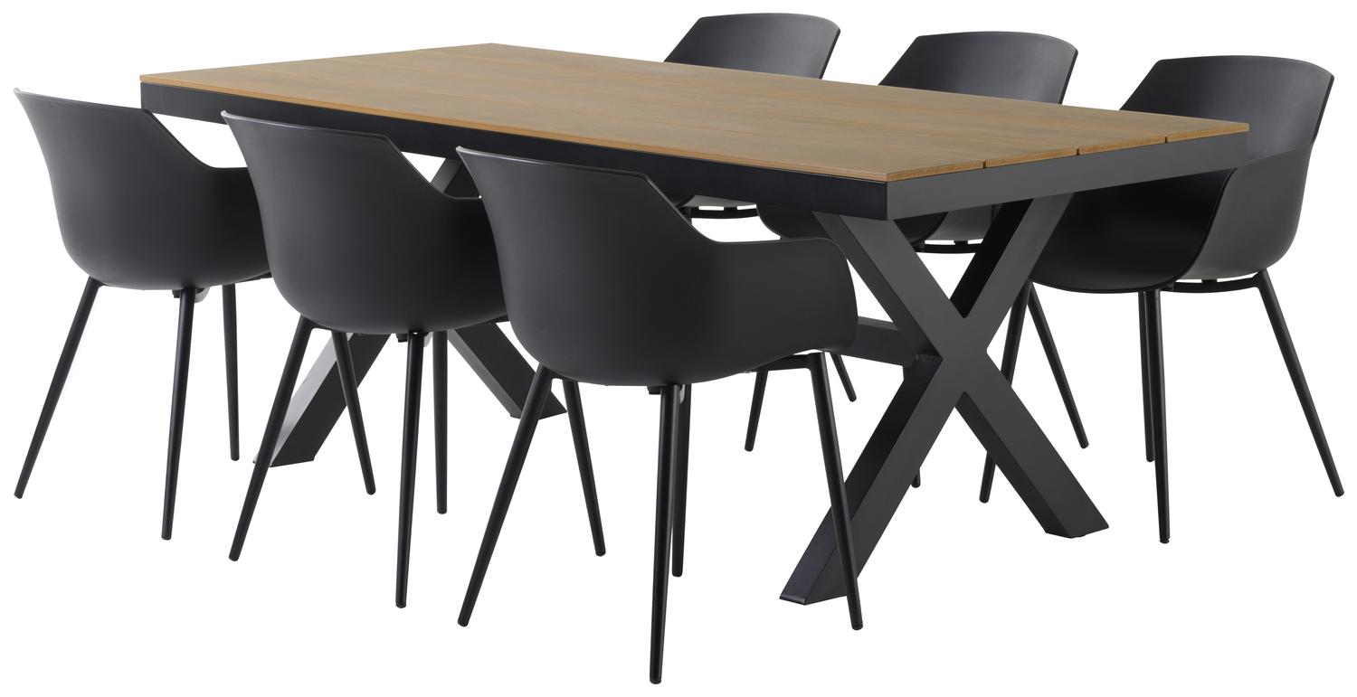 De Bahia tuinset in zwart aluminium en polywood tafelblad met 6 Paco tuinstoelen is van het merk Vinci en is hier verkrijgbaar in de kleur zwart/naturel.