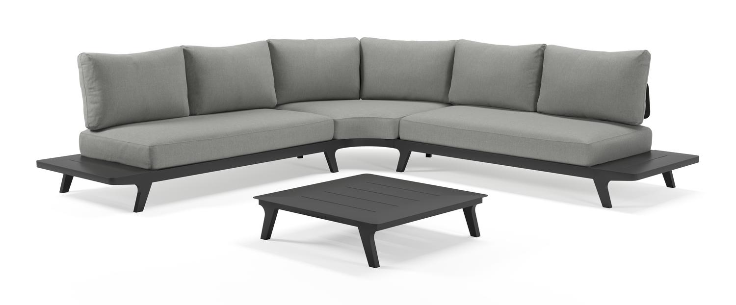 De Bolzano loungehoek in zwart aluminium met grijs weather+ softtouch kussens en loungetafel is van het merk Bristol Essentials en is hier verkrijgbaar in de kleur zwart/grijs.