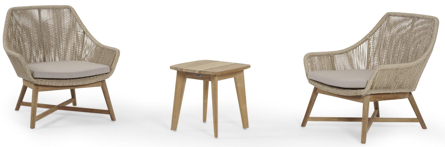 Borgo loungeset in teak en naturel gedraaide ronde wicker met natte heather beige all weather sunbrella® luxe kussens en loungetafel