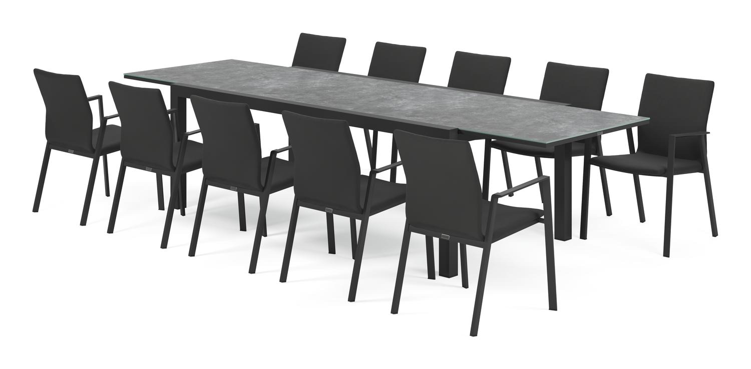De Calobra tuinset met verlengbare tafel in zwart aluminium en grijs glas tafelblad met 10 stapelbare Madura tuinstoelen is van het merk Bristol Essentials en is hier verkrijgbaar in de kleur zwart/grijs.