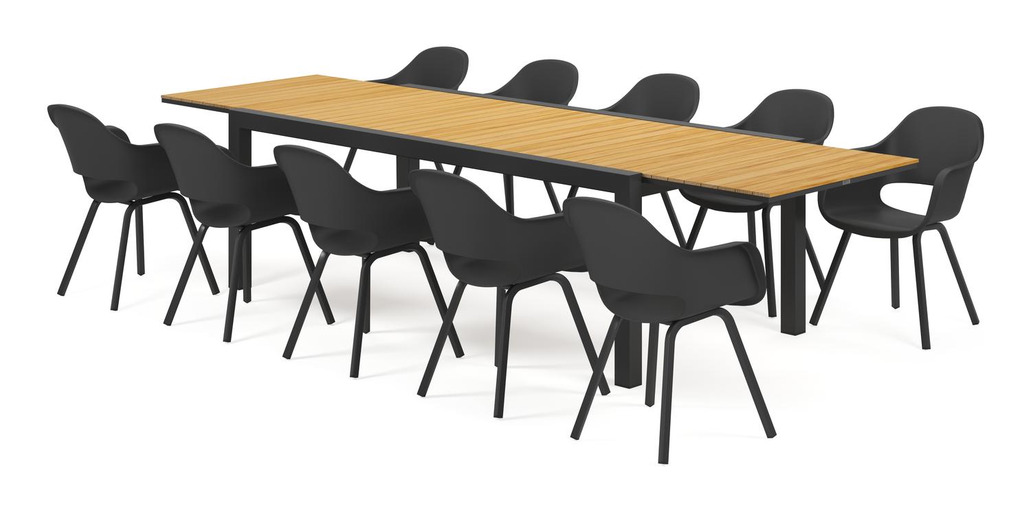 De Calobra tuinset met verlengbare tafel in zwart aluminium en teak tafelblad met 10 Artena tuinstoelen is van het merk Bristol Essentials en is hier verkrijgbaar in de kleur zwart/naturel.