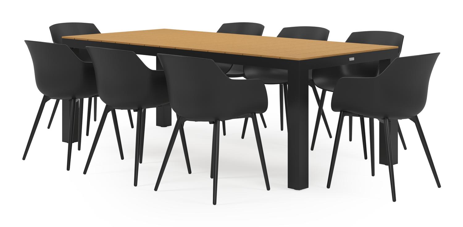 De Calzo tuinset in zwart aluminium en polywood tafelblad met 8 Paco tuinstoelen is van het merk Vinci en is hier verkrijgbaar in de kleur zwart/naturel.