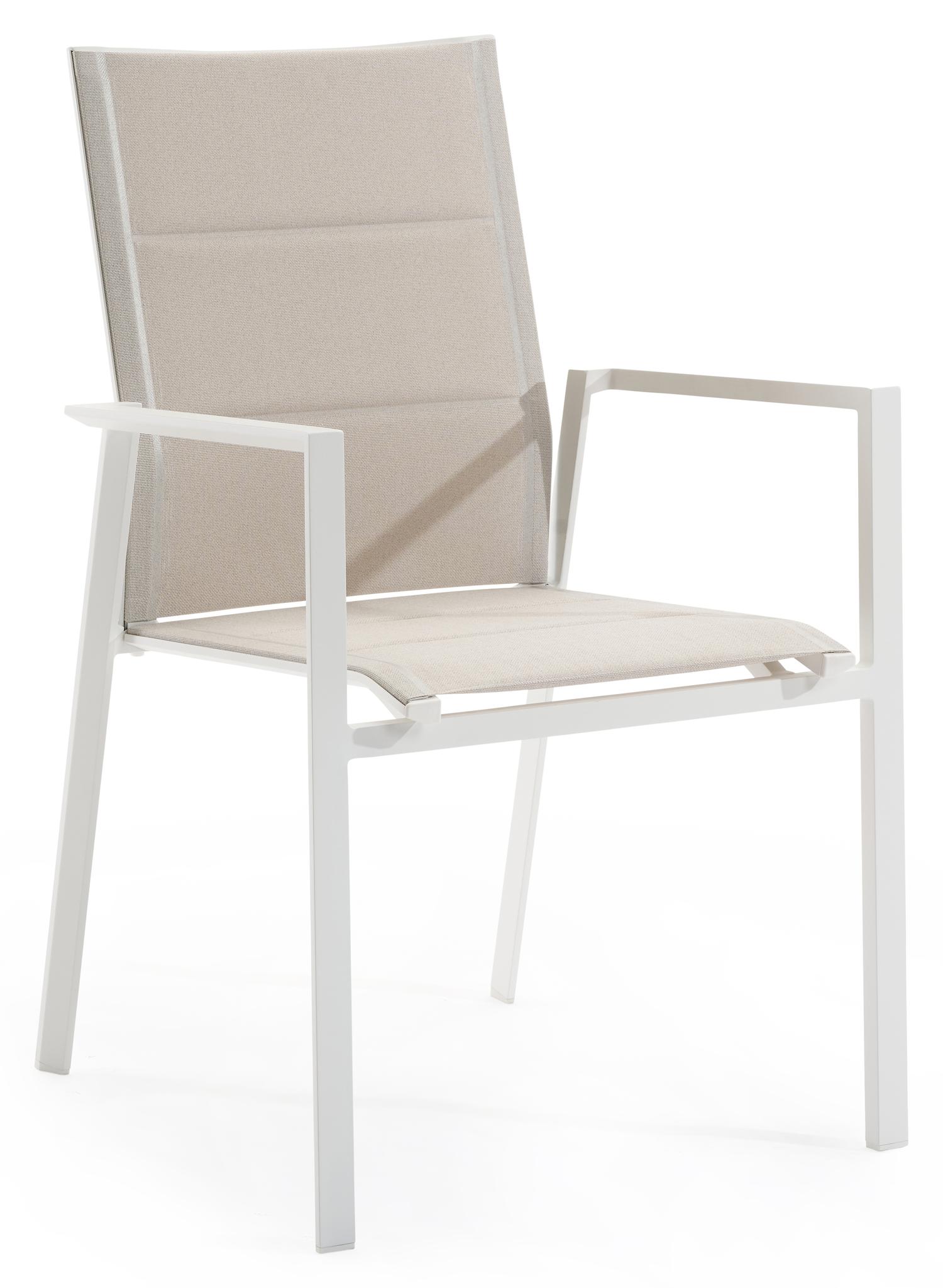 Productomschrijving Cirello stapelbare tuinstoel in wit aluminium en beige dubbele textileen