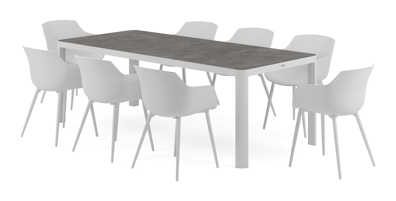 De Ellara tuinset in wit aluminium en grijs keramische print tafelblad met 8 Paco tuinstoelen is van het merk Vinci en is hier verkrijgbaar in de kleur grijs/wit.