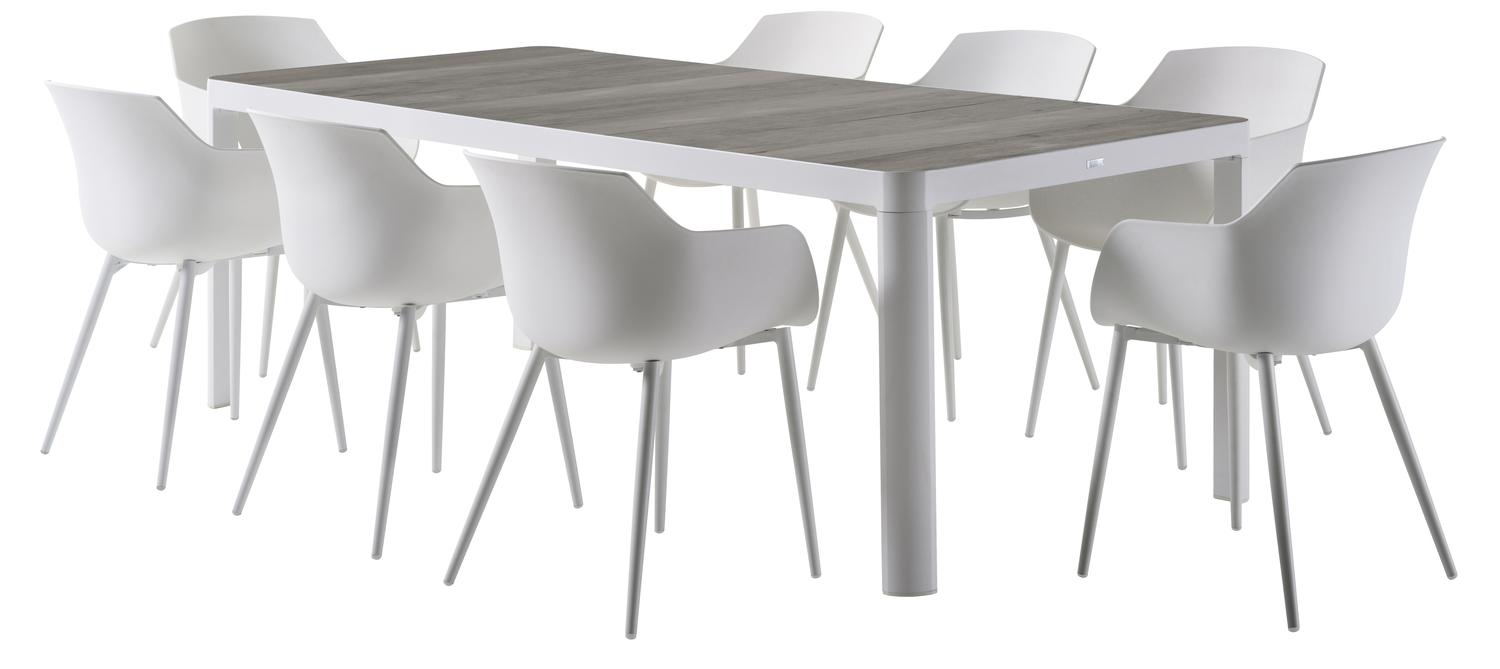 De Ellara tuinset in wit aluminium en grijs keramische tegels tafelblad met 8 Paco tuinstoelen is van het merk Vinci en is hier verkrijgbaar in de kleur grijs/wit.