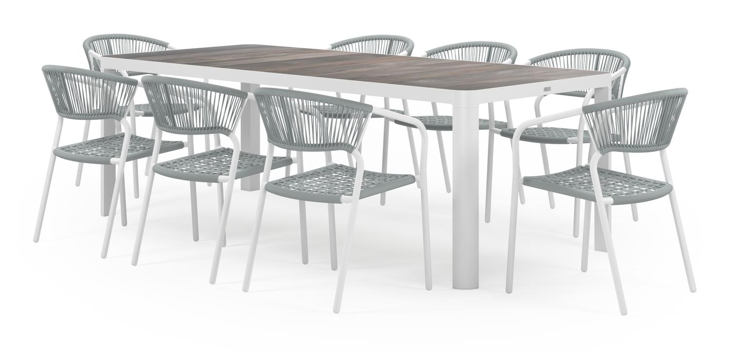 De Ellara tuinset in wit aluminium en grijs keramische tegels tafelblad met 8 stapelbare Vigo tuinstoelen is van het merk Vinci en is hier verkrijgbaar in de kleur grijs/wit.