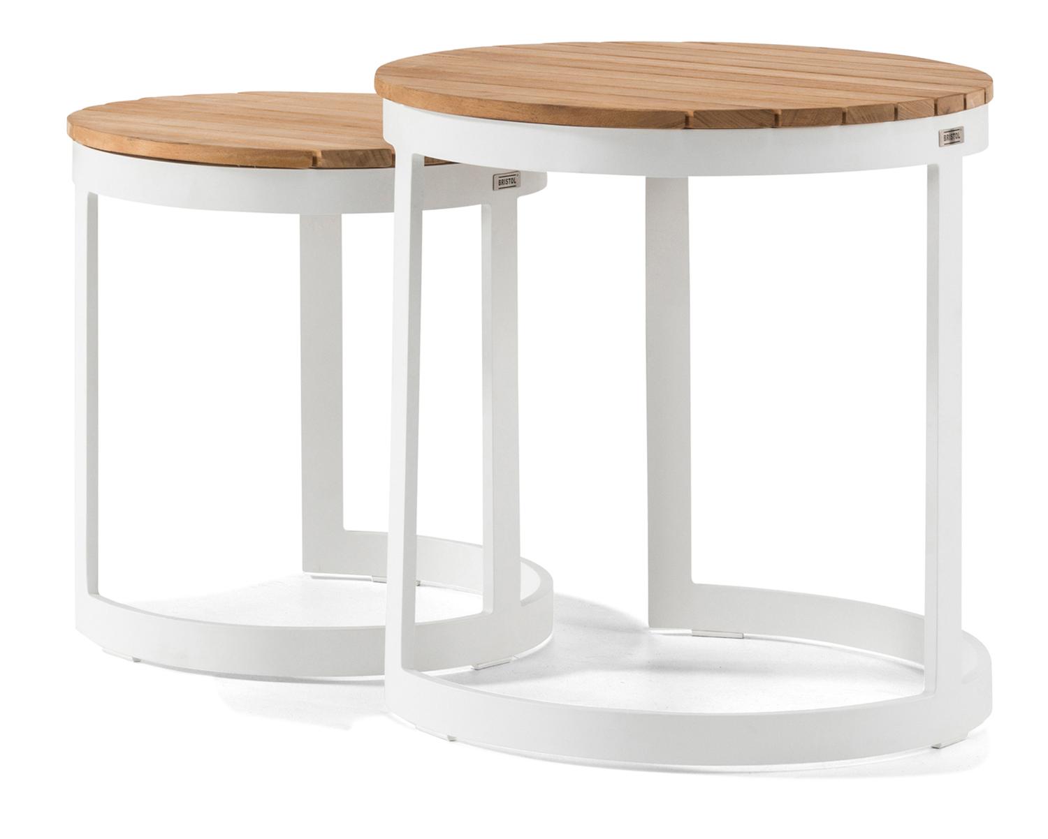 De Enna bijzettafels in wit aluminium en teak – Tafel 1 Dia. 44 x H 46 cm Tafel 2 Dia. 52 x H 52 cm is van het merk Bristolà la carte en is hier verkrijgbaar in de kleur naturel/wit.