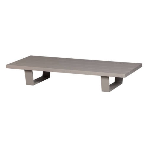 Lichtgekleurde outdoor salontafel – Lichtgewicht, aluminium framewerk – Uniek royaal tafelblad – H 25 cm x B 140 cm x D 70 cm De perfecte bijzetter voor in jouw outdoor loungehoek: de Bear salontafel uit de Exotan outdoorcollectie wordt gekenmerkt door het lichtgewicht, lichtgekleurde aluminium. Het stijlvolle potenframe houdt het tafelblad hoog en droog, ideaal voor het gehele buitenseizoen. Materiaal Aluminium is een zeer lichtgewicht, sterk en flexibel. Het aluminium uit onze collecties kennen diverse bewerkingen en afwerkingen, dit geeft het aluminium item een chique uitstraling of zelfs een verweerde, geleefde look. Aluminium is heeft een corrosiewerende werking en is daarom eveneens zeer geschikt voor outdoor gebruik. Afmetingen – Hoogte: 25 cm – Breedte: 140 cm – Diepte: 70 cm – Tafelbladdikte: 4 cm – Poothoogte: 21 cm – Pootframedikte: 9 cm – Pootframelengte: 50 cm – Afstand tussen tafelrand en poot: 20 cm – Afstand tussen poten: 82 cm – Draaggewicht: 25 kg – Gewicht: 18 kg Onderhoud Alle aluminium items uit de collectie zijn grondig behandeld en vragen dus niet om een herbehandeling. Behandeld aluminium is eenvoudig schoon te houden met een lichtvochtige doek, het nadrogen van het oppervlak zorgt voor een streeploos resultaat. Bescherm de meubelen tegen harde regenval, nachtvorst en de winterperiode met een plasticfolie of beschermhoes. Indien mogelijk is het beter dat de meubelen binnenshuis overwinteren. Levering Het artikel wordt per stuk verpakt, met een minimale afname van één stuk. De salontafel is eenvoudig te monteren aan de hand van de bijgeleverde montagehandleiding.