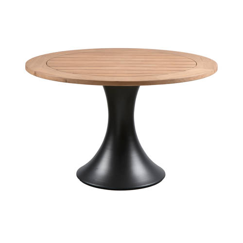 Compacte outdoor eettafel – Met een behandeld teakhouten tafelblad – Onderstel vervaardigd uit donkergekleurd aluminium – H 76 cm x Ø 122 cm De compacte outdoor eettafel Charley, uit de outdoor collectie van Exotan, zorgt gegarandeerd voor gezelligheid. Het kleine tafelformaat biedt met gemak ruimte aan 4-5 personen, ideaal voor een patio of stadstuin! Materiaal Teakhout heeft van zichzelf een donkerbruine/rode kleur en wordt gekenmerkt door een strakke, rechte nerf en is hierdoor zeer geschikt voor verwerking. Bij outdoor gebruik kan het teakhout echter wel verkleuren of ontstaan er haarscheurtjes in het hout. Afmetingen – Hoogte: 76 cm – Diameter tafelblad: Ø 122 cm – Tafelbladdikte: 3 cm – Poothoogte: 73 cm – Diameter tafelpoot: Ø14/60 cm – Draaggewicht: 150 kg Onderhoud Om een teakhouten meubel in optimale conditie te houden is het raadzaam het regelmatig te onderhouden met de daarvoor bestemde onderhoudsmiddelen. Reinig teakhout niet met te veel water, hierdoor gaan de houtvezels overeind staan en wordt het meubel erg ruw. Bescherm de meubelen tegen harde regenval, nachtvorst en de winterperiode met een plasticfolie of beschermhoes. Indien mogelijk is het beter dat de meubelen binnenshuis overwinteren.Levering Het artikel wordt per stuk geleverd in twee pakketten. De tafel is eenvoudig te monteren aan de hand van de bijgeleverde montagehandleiding.