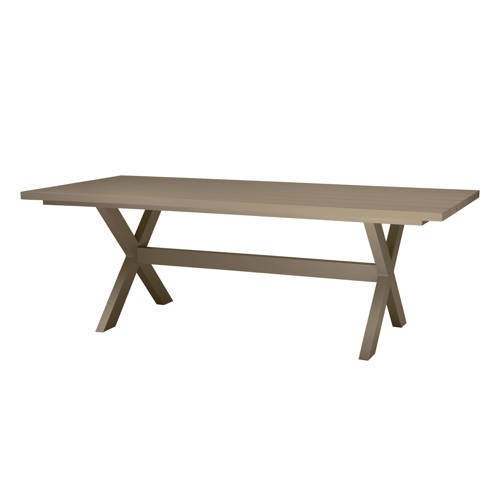 Outdoor picknicktafel – Vervaardigd uit lichtgewicht aluminium – Afgewerkt in een matte poedercoating – H 75 cm x B 220 cm x D 105 cm Een praktische tuinbank in lichtgewicht aluminium. Dat vind je in de Delta serie van het outdoormerk Exotan. De Delta picknickbank en picknicktafel zijn los te verkrijgen en uitgevoerd in een trendy gekleurde, matte poedercoating. Met de handige stelpootjes staat Delta als een huis! Materiaal Aluminium is een zeer geschikte metaalsoort voor meubelontwikkeling vanwege het lichte gewicht, sterke samenstelling en flexibiliteit. Het aluminium uit onze collecties kennen diverse bewerkingen en afwerkingen, zoals lassen, stansen, poedercoaten of natlakken. Dit geeft het aluminium item een chique uitstraling of zelfs een verweerde, geleefde look. Aluminium is heeft een corrosiewerende werking en is daarom eveneens zeer geschikt voor outdoor gebruik. Afmetingen – Hoogte: 75 cm – Breedte: 220 cm – Diepte: 105 cm – Tafelbladdikte: 4 cm – Poothoogte: 71 cm – Pootdikte: 5 cm – Lengte verstevigingsbalk: 140 cm – Tussenruimte vloer/verstevigingsbalk: 32 cm – Draaggewicht: 150 kg – Gewicht: 46 kg Onderhoud Alle aluminium items uit de collectie zijn grondig behandeld en vragen dus niet om een herbehandeling. Mocht het aluminium beschadigd zijn, raadpleeg dan een gespecialiseerde verfzaak. Behandeld aluminium is eenvoudig schoon te houden met een lichtvochtige doek en een mild schoonmaakmiddel, het nadrogen van het oppervlak zorgt voor een streeploos resultaat. Levering Het artikel wordt geleverd in één pakket met een minimale afname van één stuk. Het artikel is eenvoudig te monteren aan de hand van de bijgeleverde montagehandleiding. Bij binnenshuis gebruik: plaats voor het beschermen van harde vloeren viltglijders aan de onderzijde van de poten, dit voorkomt beschadigingen.Bescherm de meubelen tegen harde regenval, nachtvorst en de winterperiode met een plasticfolie of beschermhoes. Indien mogelijk is het beter dat de meubelen binnenshuis overwinteren.