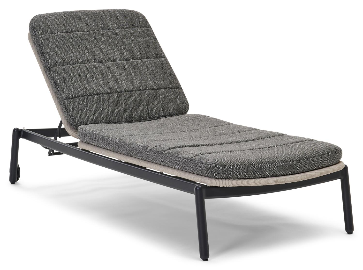 Fano verstelbaar ligbed in zwart aluminium en beige vierkant geweven ronde rope met savane tornado all weather sunbrella® luxe kussen