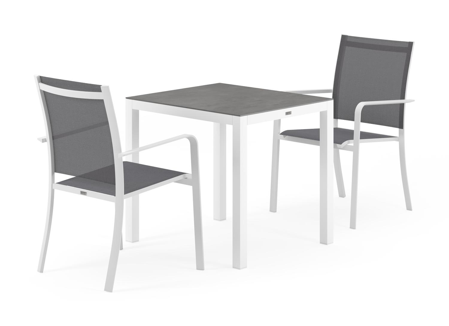 De Feltro tuinset in wit aluminium en grijs volkeramiek tafelblad met 2 stapelbare Calobra tuinstoelen is van het merk Bristol Essentials en is hier verkrijgbaar in de kleur grijs/wit.