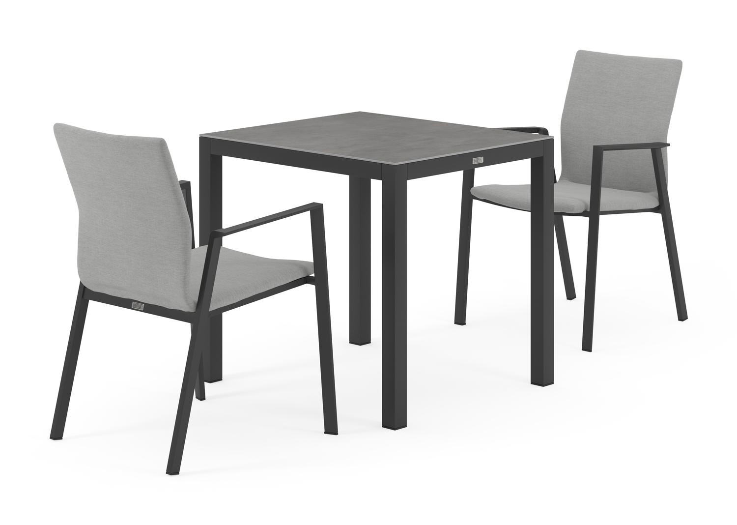 De Feltro tuinset in zwart aluminium en grijs volkeramiek tafelblad met 2 stapelbare Madura tuinstoelen is van het merk Bristol Essentials en is hier verkrijgbaar in de kleur zwart/grijs.