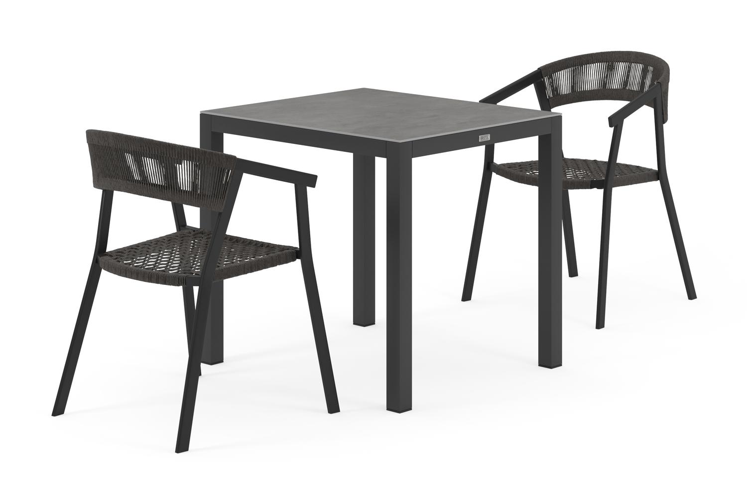 De Feltro tuinset in zwart aluminium en grijs volkeramiek tafelblad met 2 stapelbare Viaro tuinstoelen is van het merk Bristol Essentials en is hier verkrijgbaar in de kleur zwart/grijs.