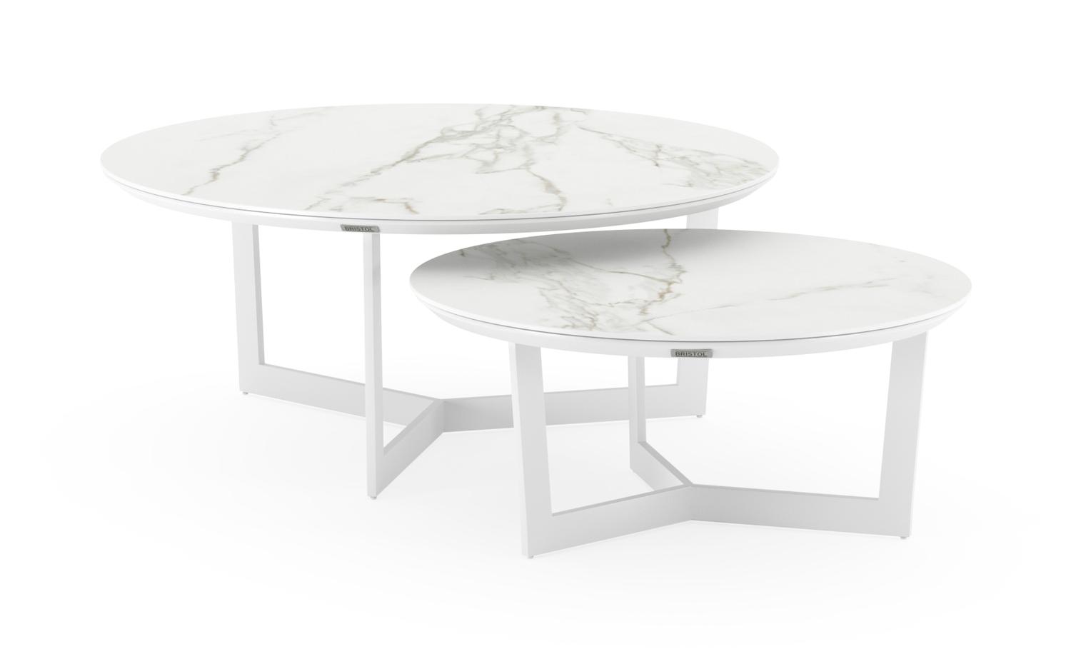 Lacrima loungetafels in wit aluminium en calacatta volkeramiek – Dia. 85/65 x H 35/30 cm