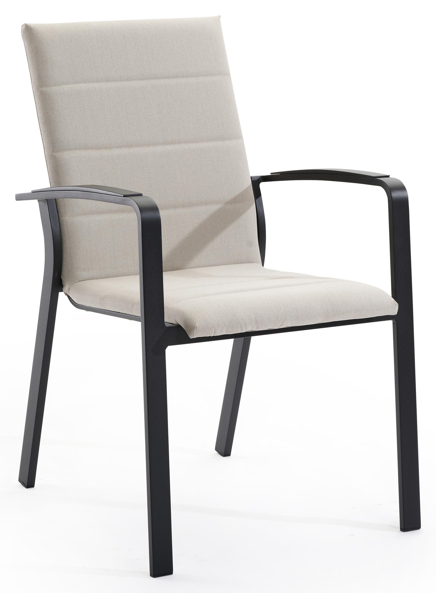 Productomschrijving Lioni stapelbare tuinstoel in zwart aluminium en beige luxe textileen