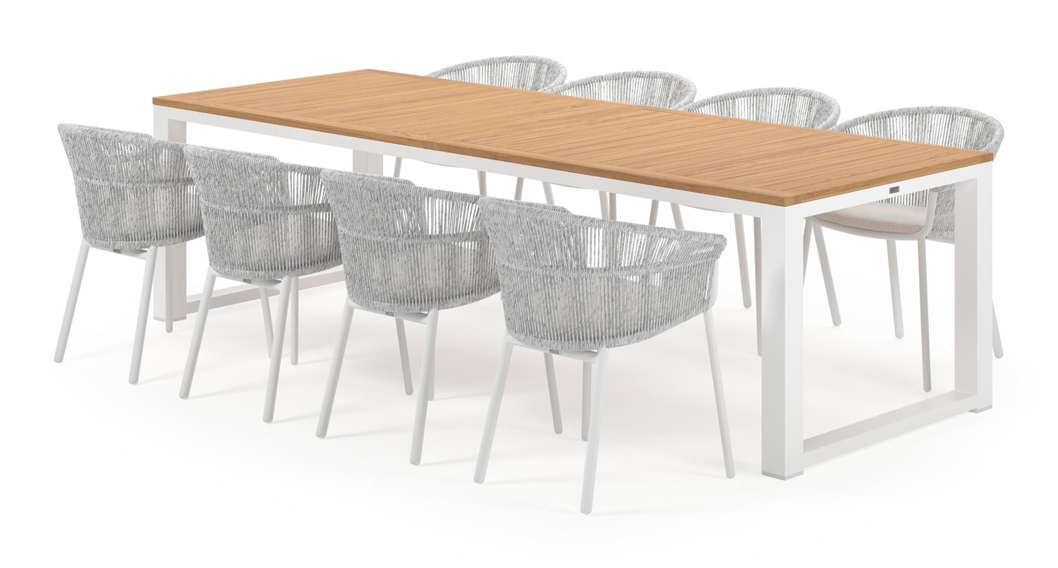 De Livo tuinset in wit aluminium en natural finish teak tafelblad met 8 stapelbare Matera tuinstoelen is van het merk Bristol Essentials en is hier verkrijgbaar in de kleur wit/naturel.
