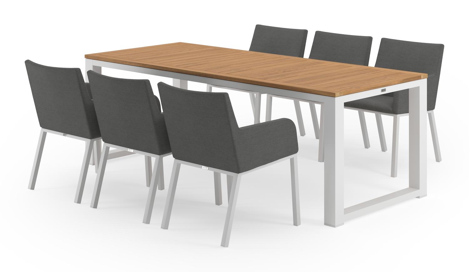 Livo tuinset in wit aluminium en teak tafelblad met 6 Rivo tuinstoelen