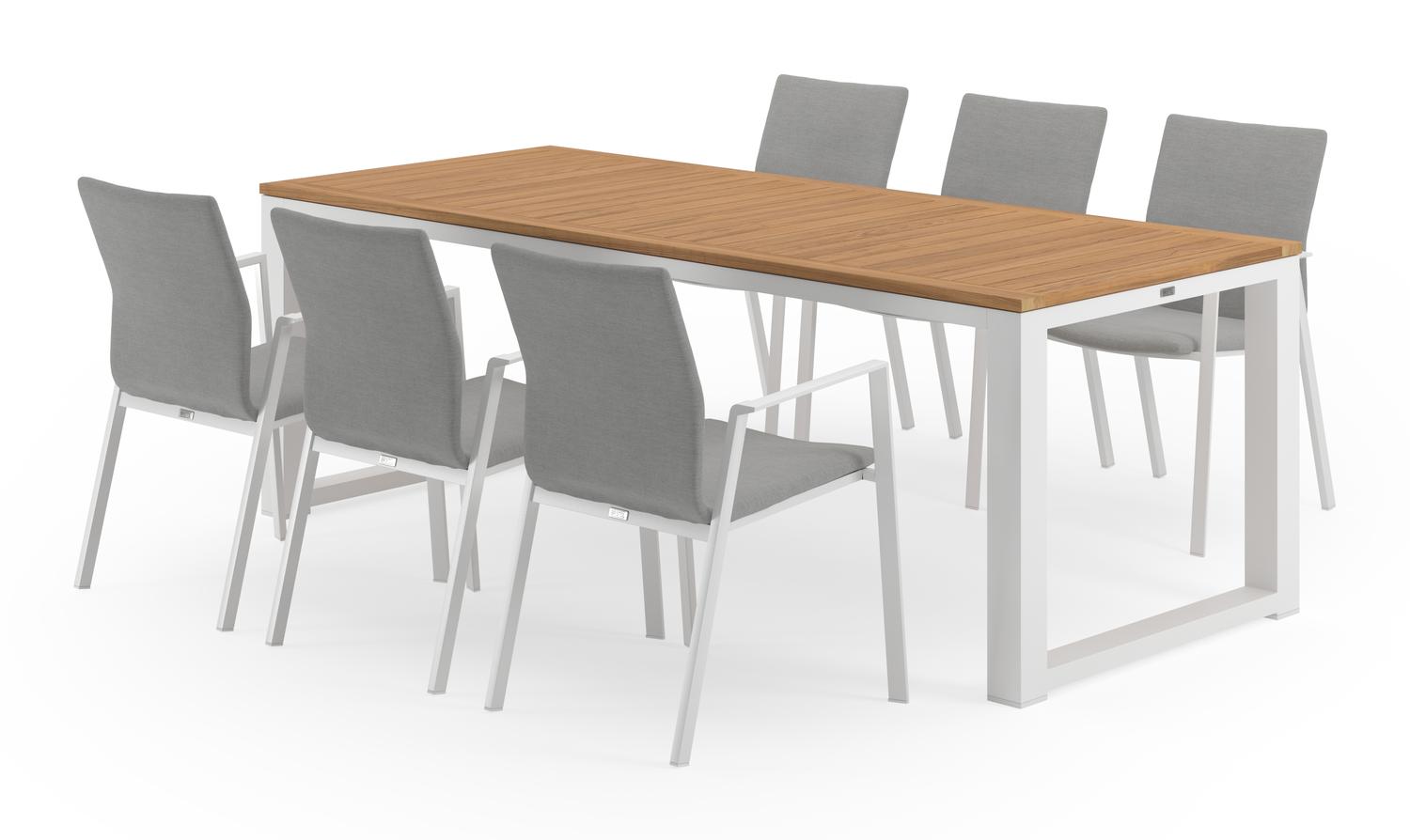 De Livo tuinset in wit aluminium en teak tafelblad met 6 stapelbare Madura tuinstoelen is van het merk Bristol Essentials en is hier verkrijgbaar in de kleur grijs/naturel/wit.
