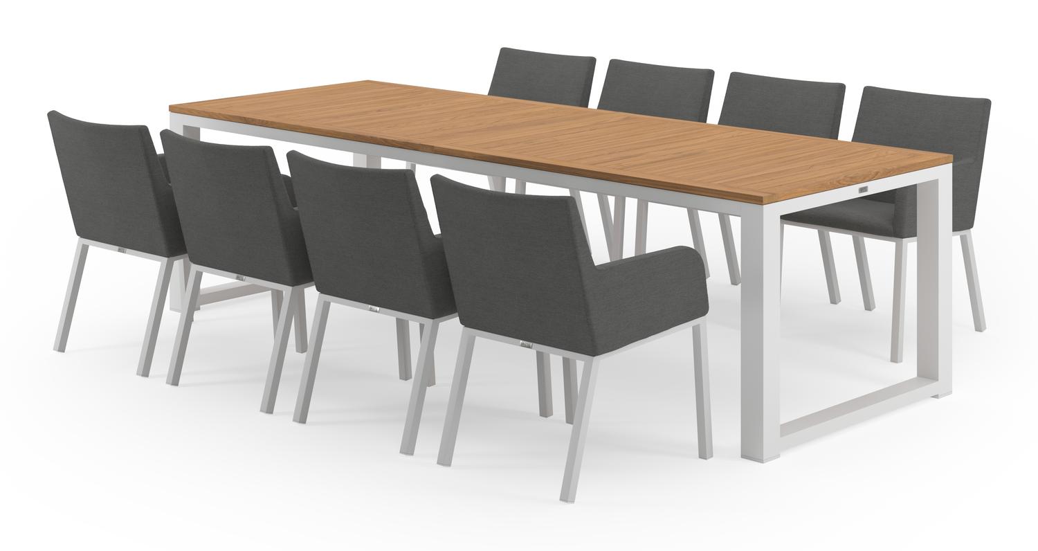 De Livo tuinset in wit aluminium en teak tafelblad met 8 Rivo tuinstoelen is van het merk Bristol Essentials en is hier verkrijgbaar in de kleur wit/naturel/grijs.