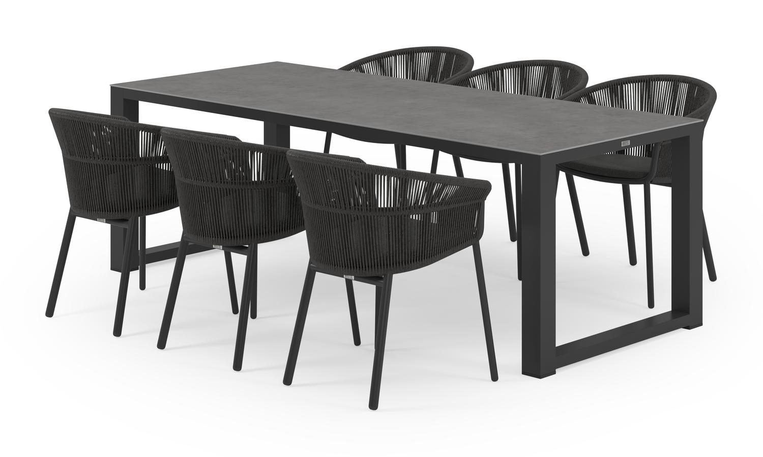 De Livo tuinset in zwart aluminium en grijs volkeramiek tafelblad met 6 stapelbare Matera tuinstoelen is van het merk Bristol Essentials en is hier verkrijgbaar in de kleur zwart/grijs.