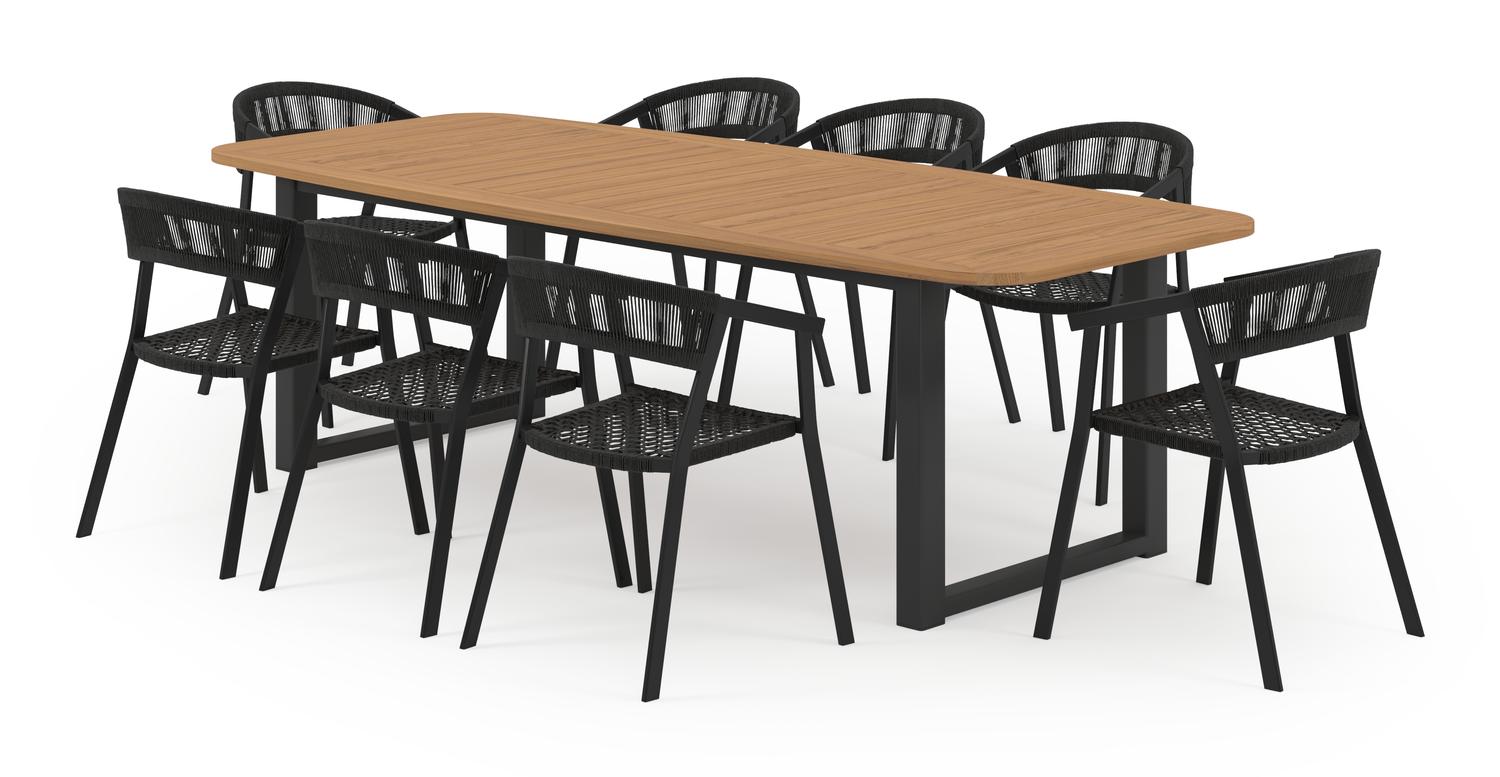 De Livo tuinset in zwart aluminium en natural finish teak tafelblad met 8 stapelbare Viaro tuinstoelen is van het merk Bristol Essentials en is hier verkrijgbaar in de kleur zwart/naturel.