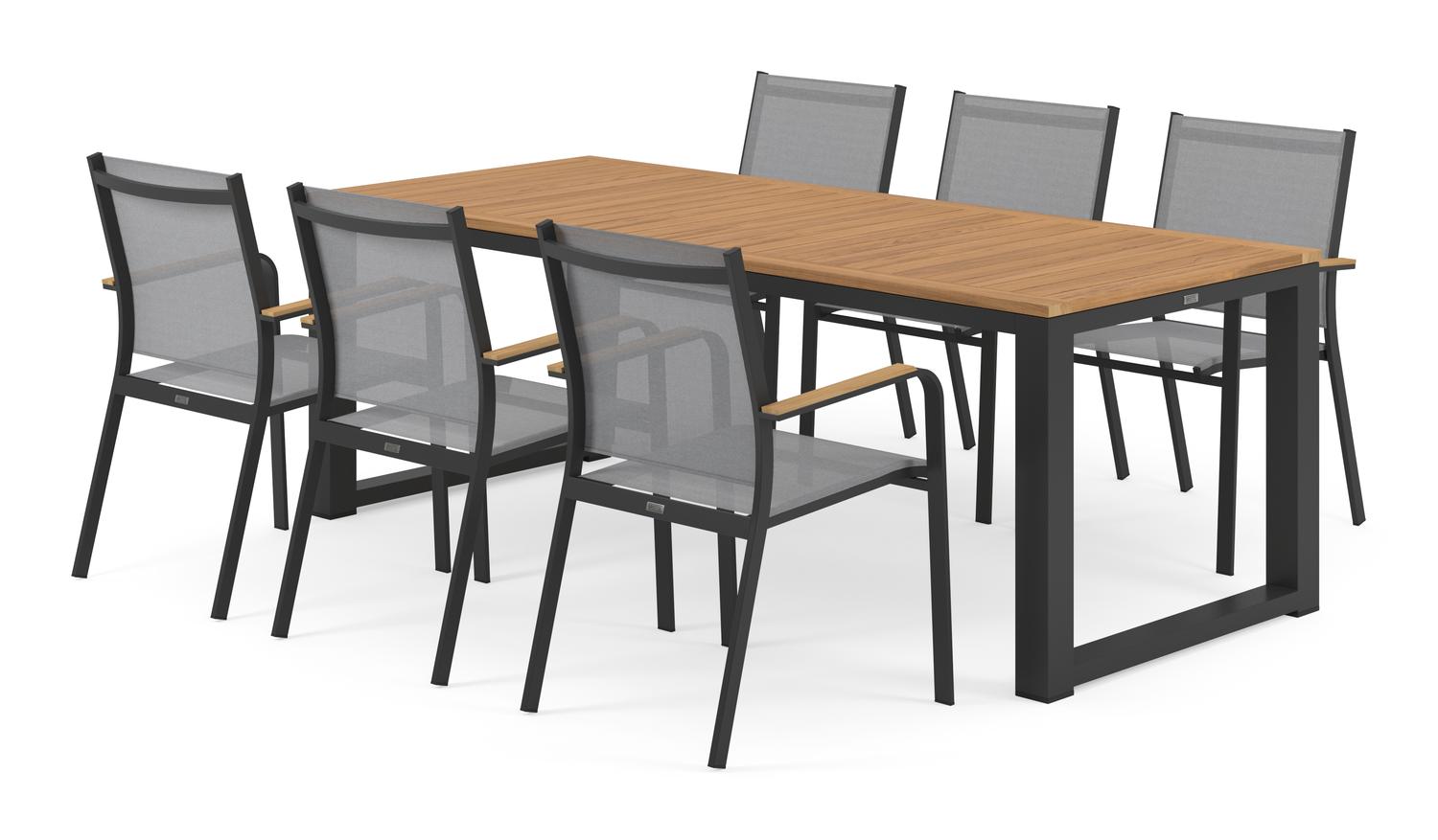Livo tuinset in zwart aluminium en teak tafelblad met 6 stapelbare Amalfi tuinstoelen