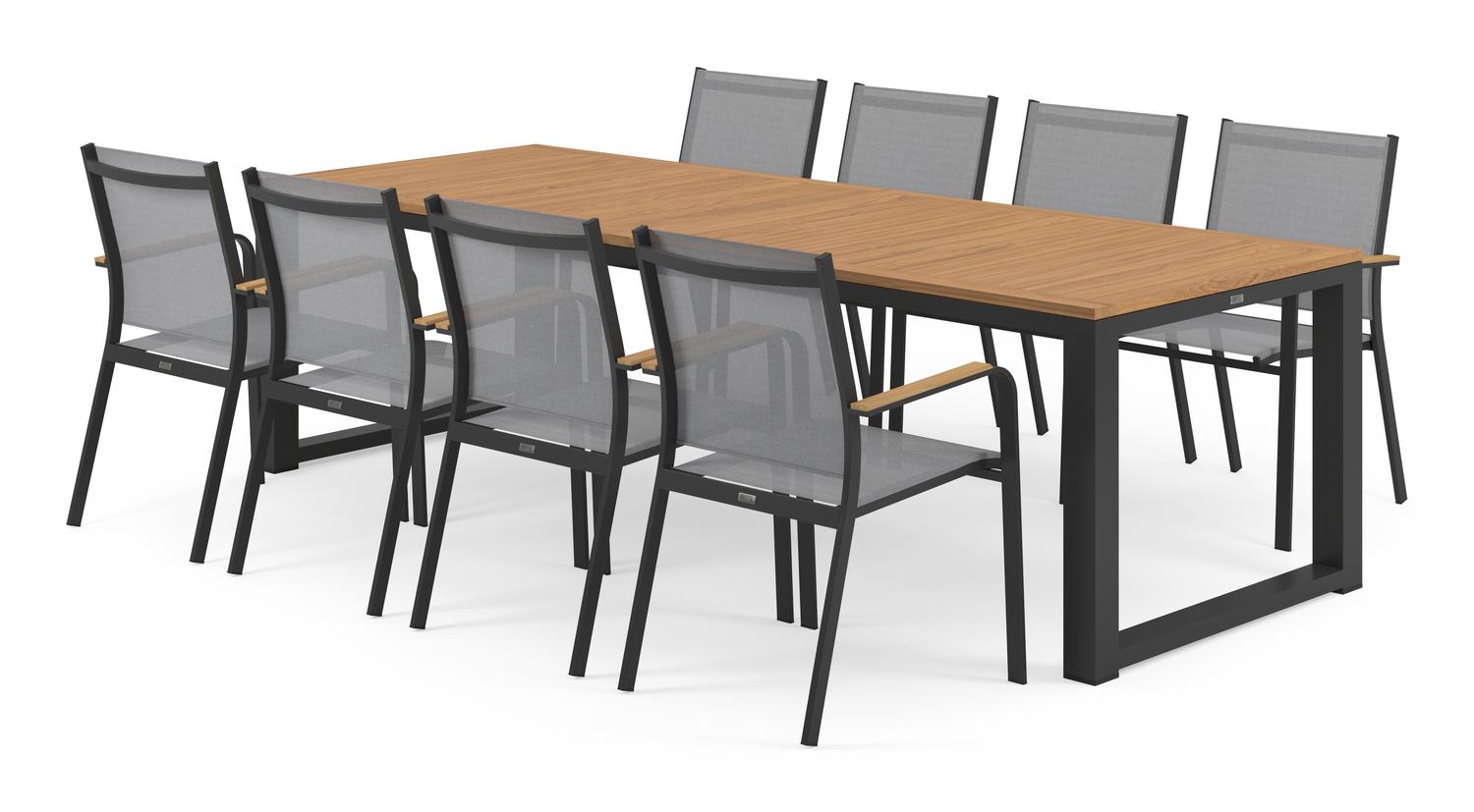 Livo tuinset in zwart aluminium en teak tafelblad met 8 stapelbare Amalfi tuinstoelen
