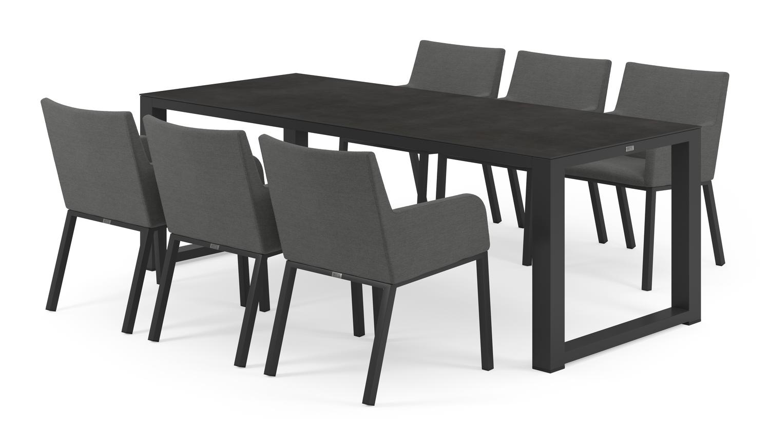 De Livo tuinset in zwart aluminium en zwart volkeramiek tafelblad met 6 Rivo tuinstoelen is van het merk Bristol Essentials en is hier verkrijgbaar in de kleur zwart/grijs.