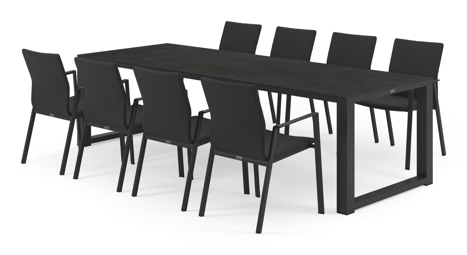 De Livo tuinset in zwart aluminium en zwart volkeramiek tafelblad met 8 stapelbare Madura tuinstoelen is van het merk Bristol Essentials en is hier verkrijgbaar in de kleur zwart.