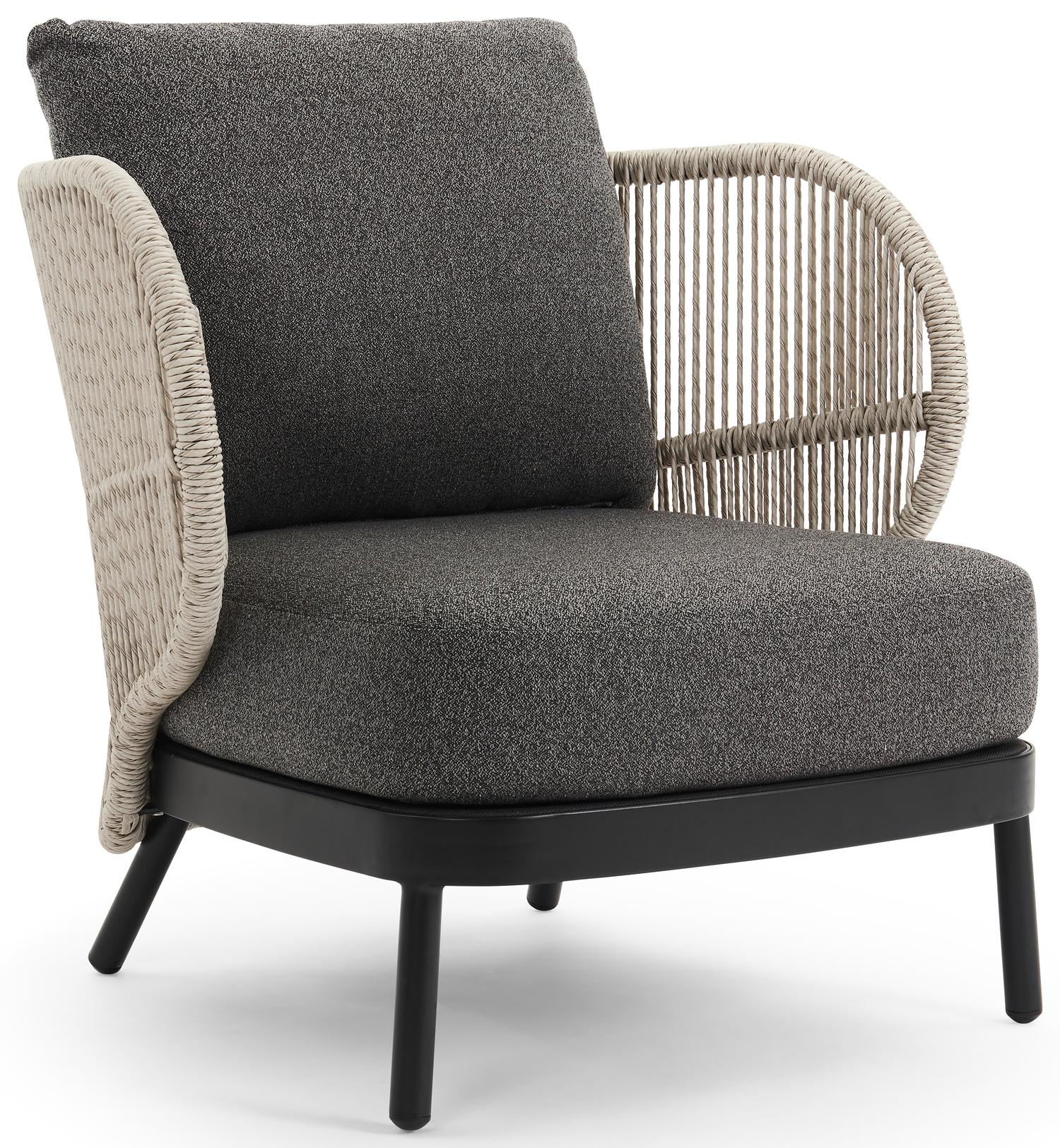De Lugano loungestoel in zwart aluminium en beige gedraaide ronde wicker met catania black all weather cosytica kussen is van het merk Bristolà la carte en is hier verkrijgbaar in de kleur zwart/beige.