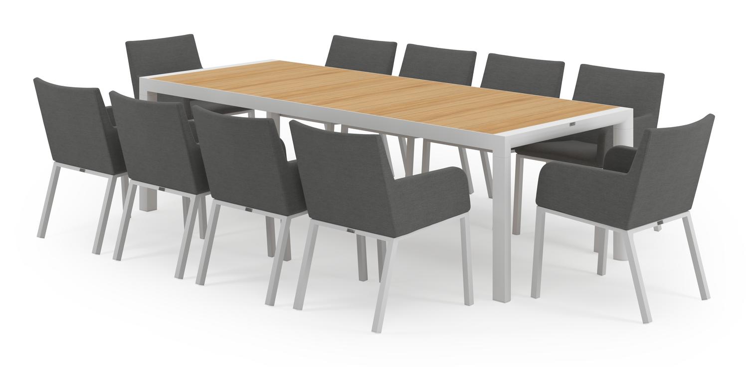 De Madura tuinset in wit aluminium en teak tafelblad met 10 Rivo tuinstoelen is van het merk Bristol Essentials en is hier verkrijgbaar in de kleur wit/naturel/grijs.