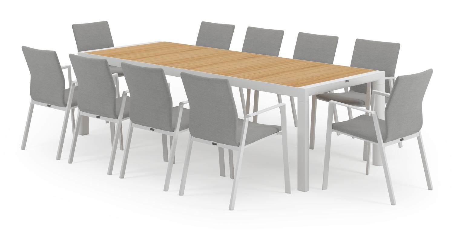 Madura tuinset in wit aluminium en teak tafelblad met 10 stapelbare Madura tuinstoelen