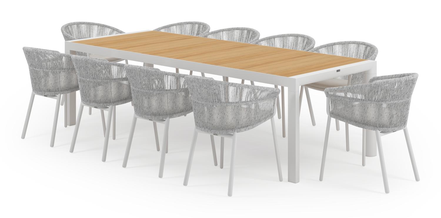 De Madura tuinset in wit aluminium en teak tafelblad met 10 stapelbare Matera tuinstoelen is van het merk Bristol Essentials en is hier verkrijgbaar in de kleur wit/naturel.