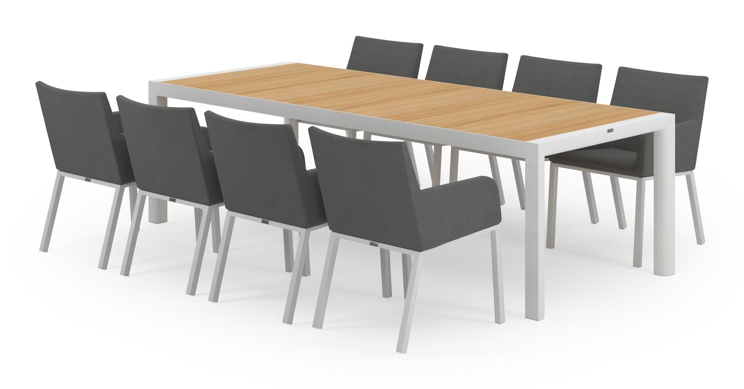 De Madura tuinset in wit aluminium en teak tafelblad met 8 Rivo tuinstoelen is van het merk Bristol Essentials en is hier verkrijgbaar in de kleur wit/naturel/grijs.
