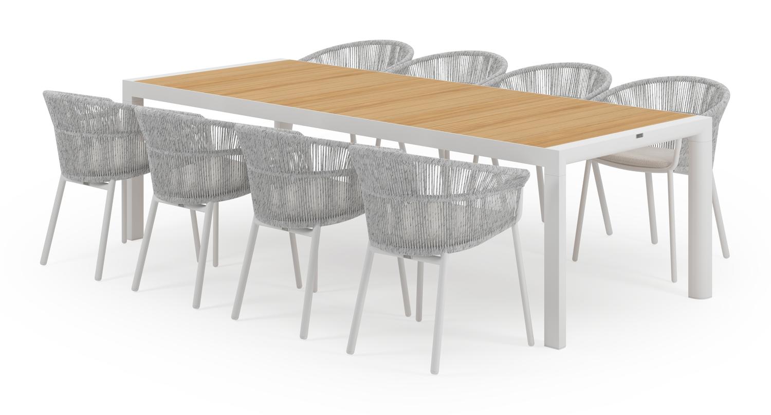 De Madura tuinset in wit aluminium en teak tafelblad met 8 stapelbare Matera tuinstoelen is van het merk Bristol Essentials en is hier verkrijgbaar in de kleur wit/naturel.