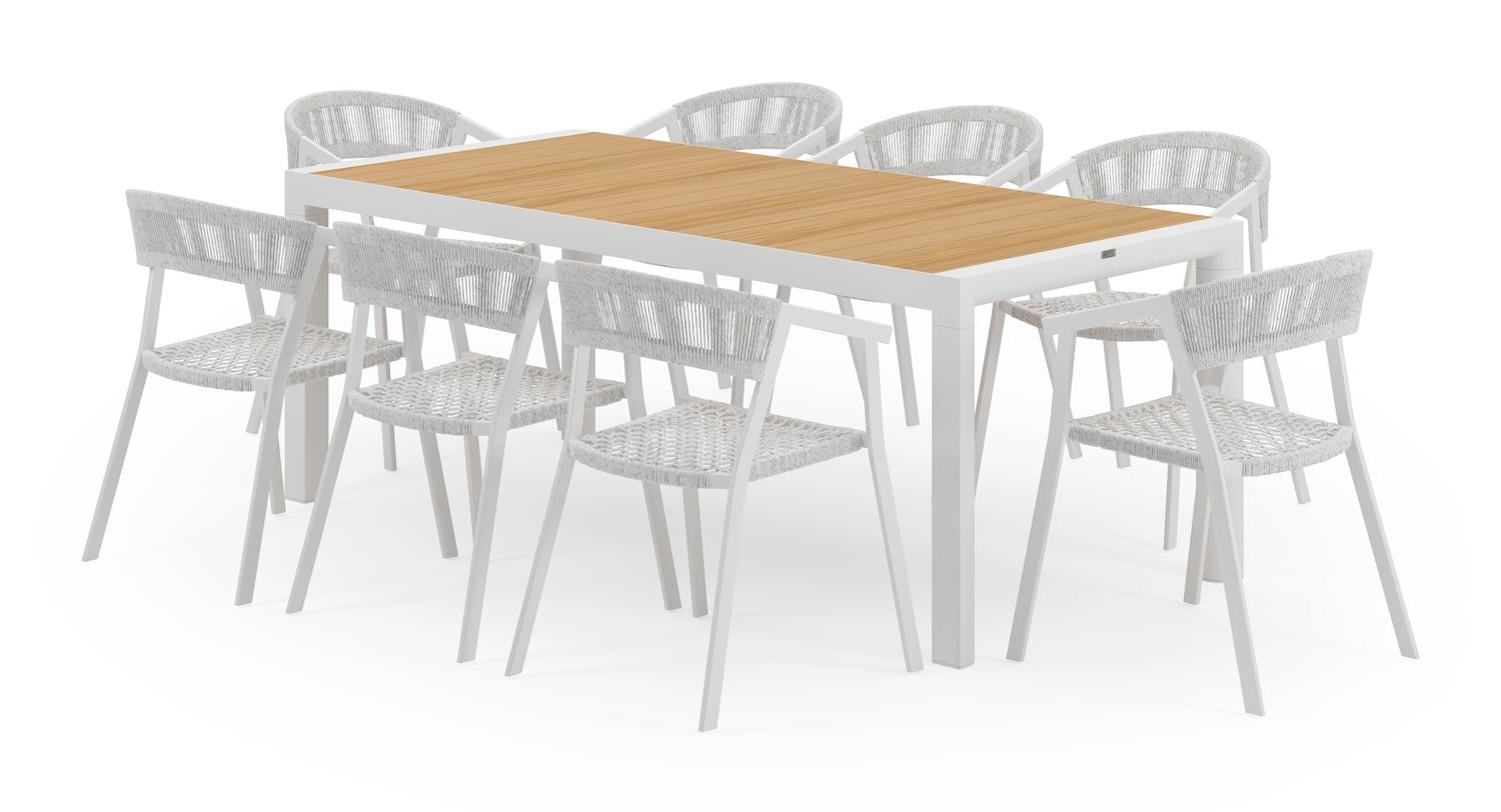De Madura tuinset in wit aluminium en teak tafelblad met 8 stapelbare Viaro tuinstoelen is van het merk Bristol Essentials en is hier verkrijgbaar in de kleur wit/naturel/grijs.