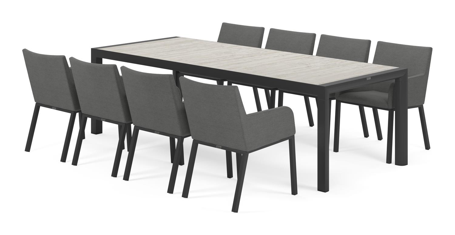 Madura tuinset in zwart aluminium en grijs keramische tegels tafelblad met 8 Rivo tuinstoelen