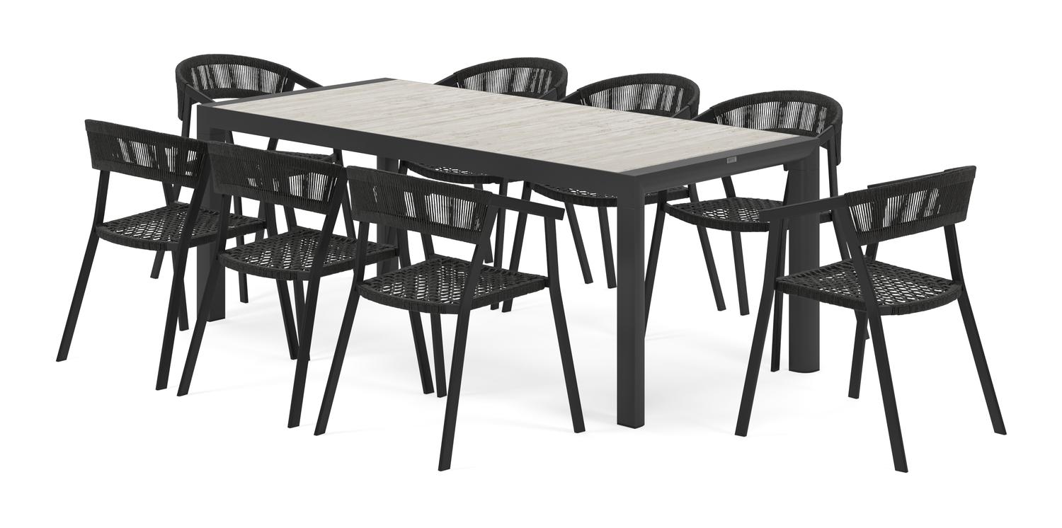 De Madura tuinset in zwart aluminium en keramische tegels tafelblad met 8 stapelbare Viaro tuinstoelen is van het merk Bristol Essentials en is hier verkrijgbaar in de kleur zwart/grijs.