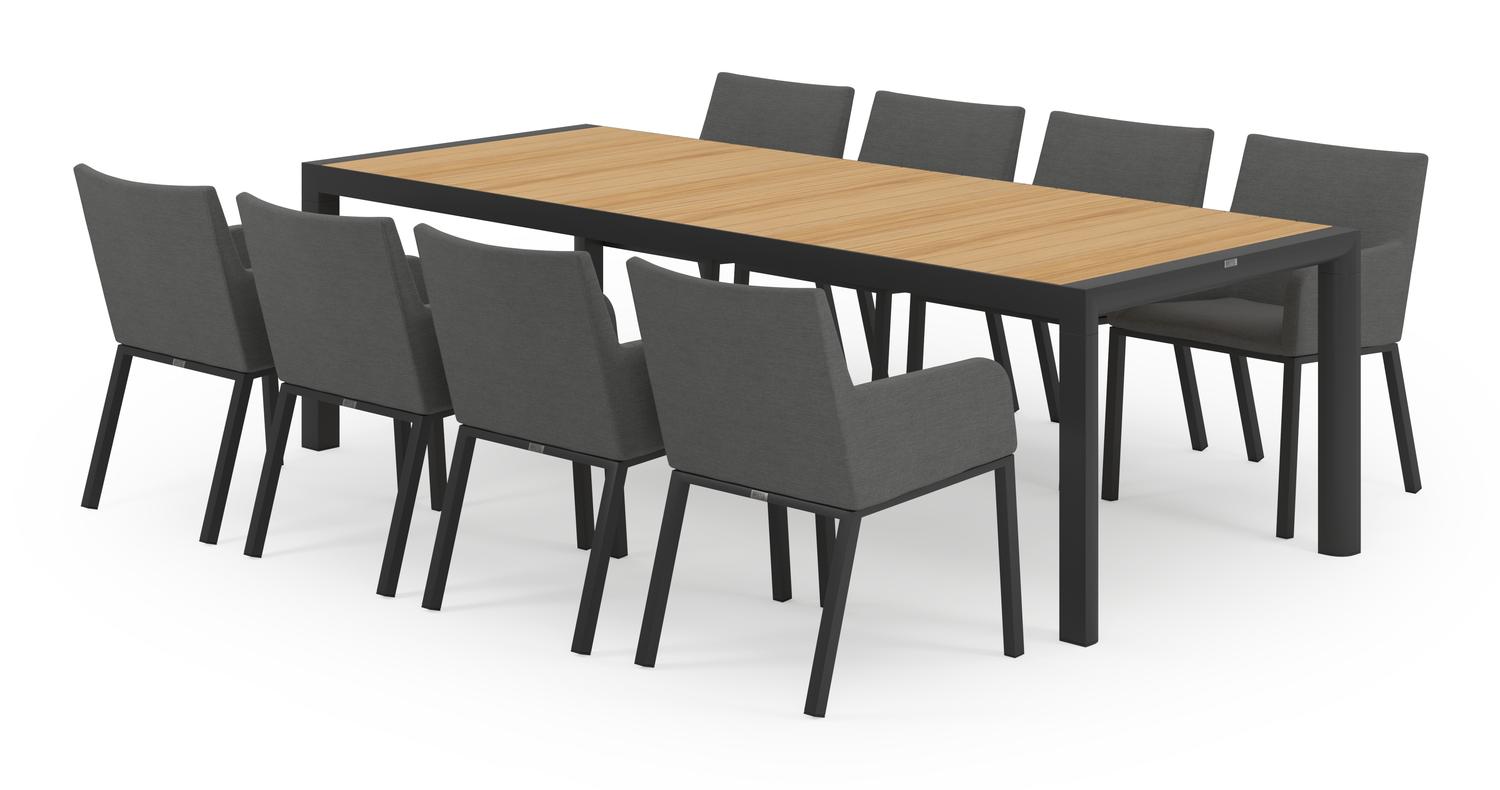 De Madura tuinset in zwart aluminium en natural finish teak tafelblad met 8 Rivo tuinstoelen is van het merk Bristol Essentials en is hier verkrijgbaar in de kleur zwart/naturel/grijs.