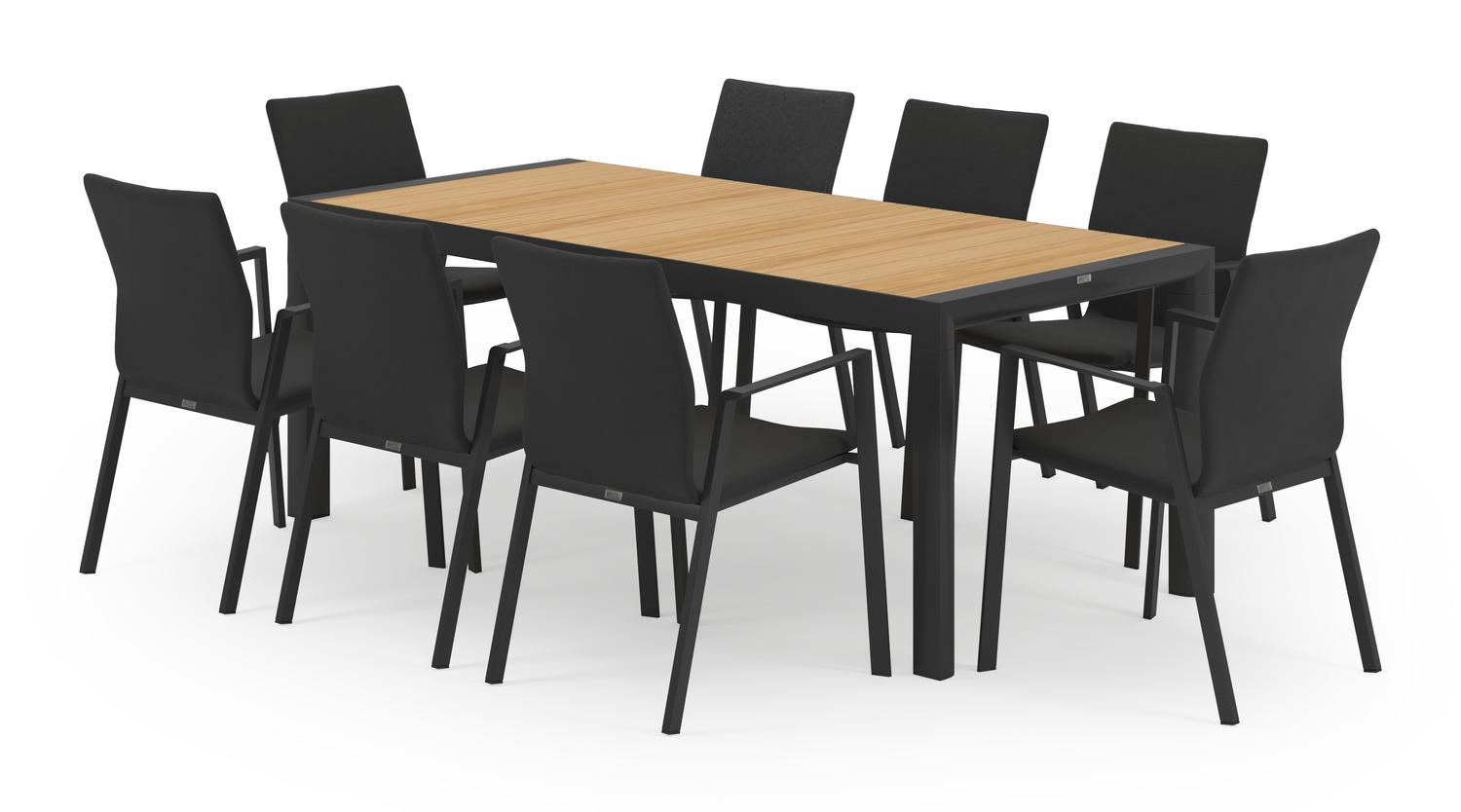 De Madura tuinset in zwart aluminium en teak tafelblad met 8 stapelbare Madura tuinstoelen is van het merk Bristol Essentials en is hier verkrijgbaar in de kleur zwart/naturel.