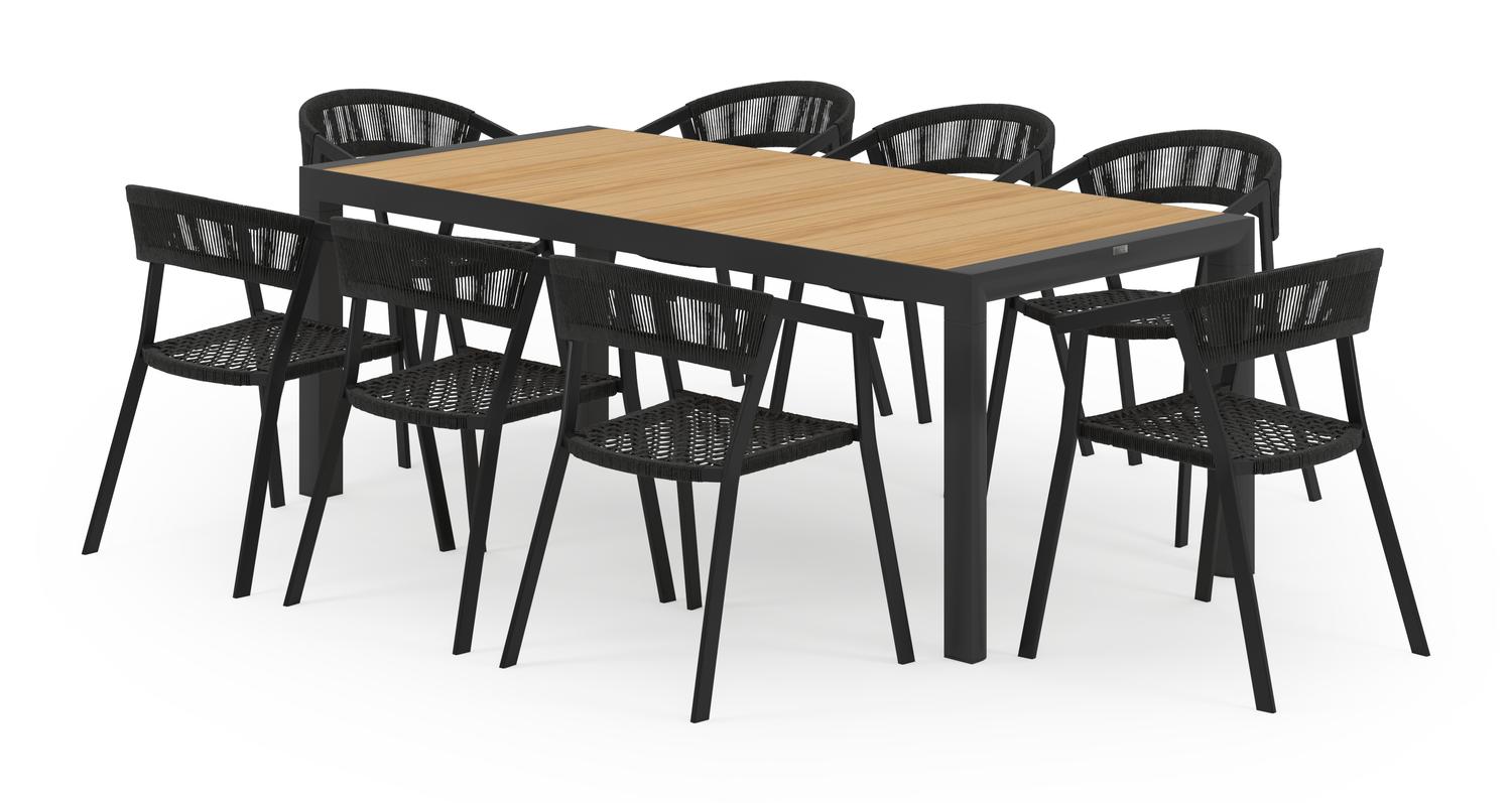 De Madura tuinset in zwart aluminium en teak tafelblad met 8 stapelbare Viaro tuinstoelen is van het merk Bristol Essentials en is hier verkrijgbaar in de kleur zwart/naturel.