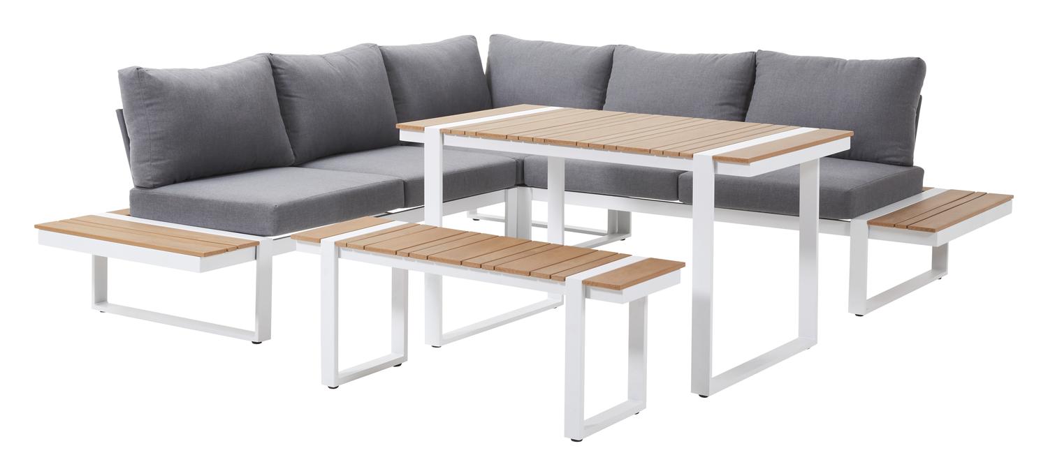 De Merida loungehoek in wit aluminium en grijs textilene met grijs polyester kussens en loungetafel is van het merk Vinci en is hier verkrijgbaar in de kleur grijs/wit.