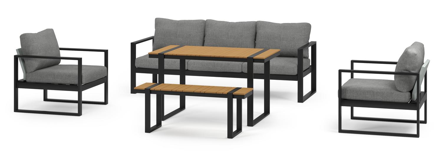 De Merida loungeset in zwart aluminium en aluminium met polyester kussen en loungetafel is van het merk Vinci en is hier verkrijgbaar in de kleur zwart/grijs/naturel.