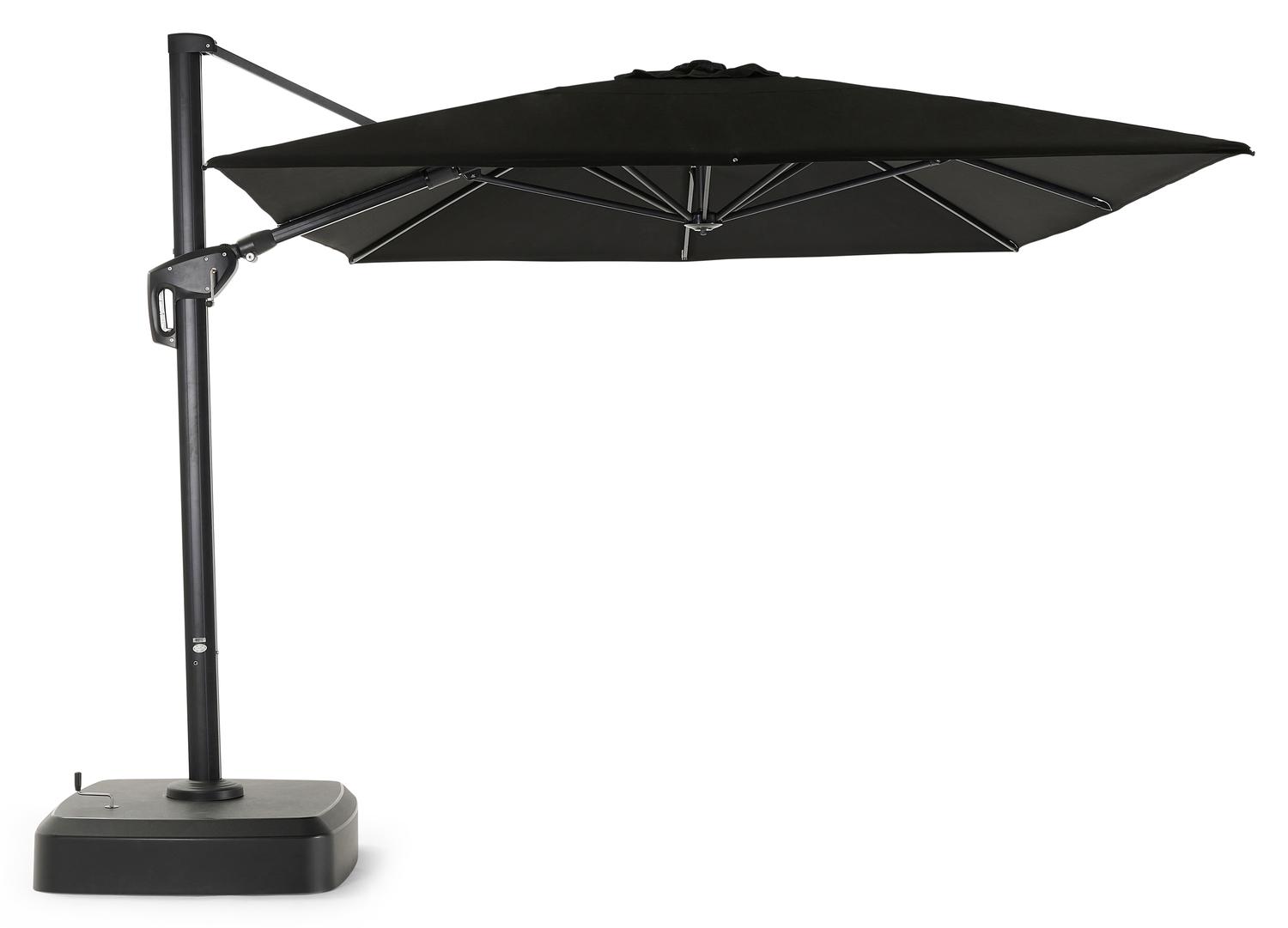 De Minore zweefparasol met tiltfunctie in zwart aluminium met zwart all weather sunbrella® premium parasoldoek – L1 400 x L2 300 cm (met voet) is van het merk Bristolà la carte en is hier verkrijgbaar in de kleur zwart.
