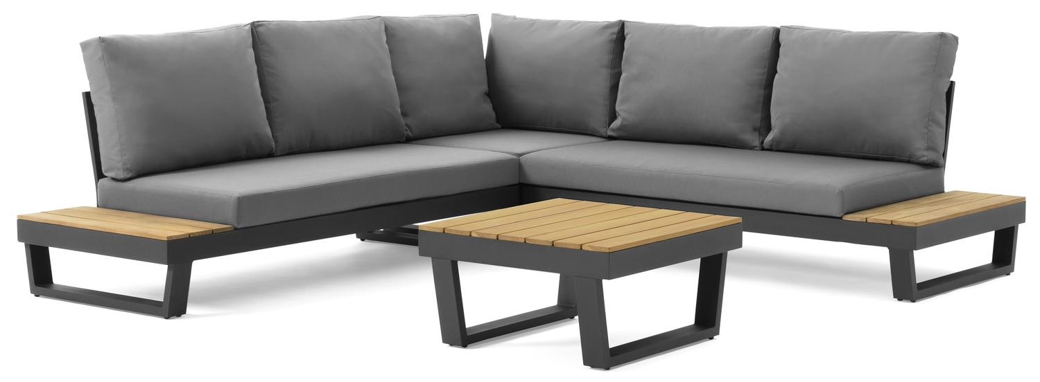 De Modica loungehoek in zwart aluminium en teak met grijs weather+ textileen kussens en loungetafel is van het merk Bristol Essentials en is hier verkrijgbaar in de kleur zwart.