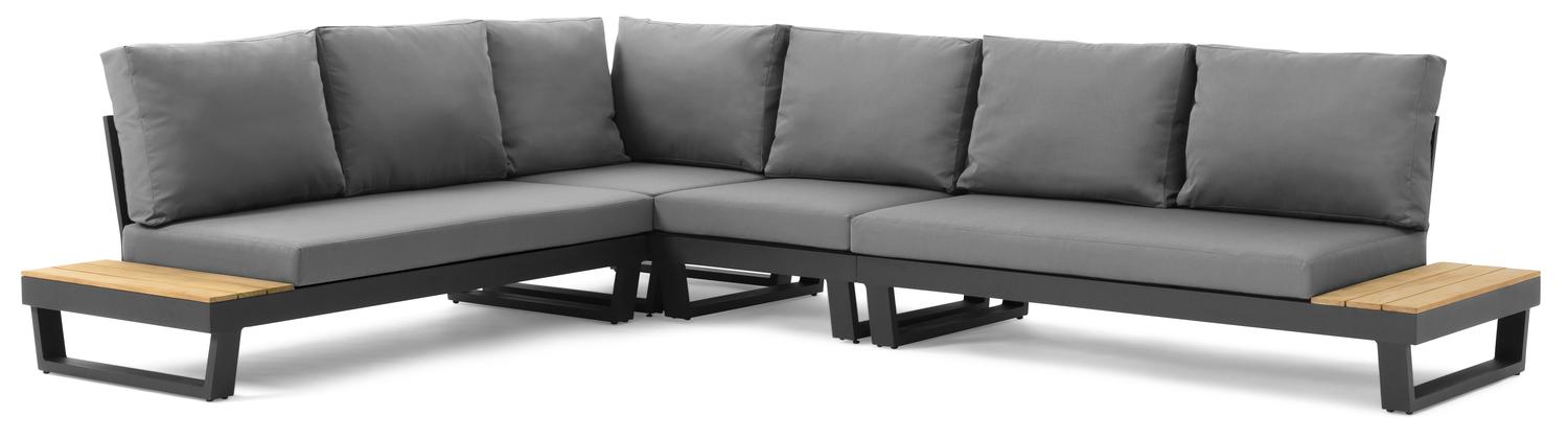 De Modica loungehoek in zwart aluminium en teak met grijs weather+ textilene kussens is van het merk Bristol Essentials en is hier verkrijgbaar in de kleur zwart/grijs.